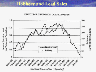 | Ecological studies support the reality of the lead /crime association. These two slides, form a paper by Nevin, show the time course of murder rates and major crime rates, lagged 18years after the annual sales of lead in gasoline. |