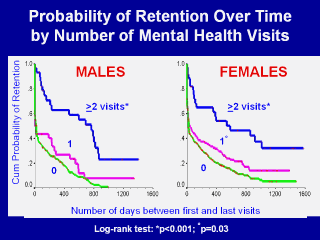 | For both males and females, having two or more MH counseling visits was associated with significantly longer retention times compared to having only one or no such visit. In addition, among females, those with one MH visit tended to be retained significantly longer than those with no such visit. |
