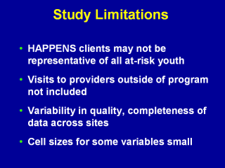 our study include the following. First, our study population may not be representative of all at-risk youth and, therefore, our findings may have limited generalizability to other populations of at-risk youth. Second, our dataset did not include visits to providers outside the HAPPENS program and so we may not have the whole picture of care received by our clients. Third, there was variability in the quality and completeness of data collection across the 8 sites. Fourth, cell sizes for some variables were small increasing the likelihood of a Type II error. |