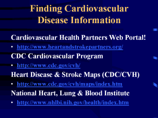 | Aside from the wealth of resources available for finding good information, I have included an example. What can you find about cardiovascular disease, the leading killer of the 21st century? These links are really examples of how a Public Health problem is addressed, through collaboration among government agencies and nonprofit groups. |