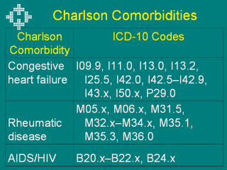 Congestive heart failure, rheumatic disease, AIDS/HIV and corresponding ICD-10 codes are three examples of the translated Charlson comorbidities. The complete list of the 16 translated Charlson comorbidities can be found here (link).