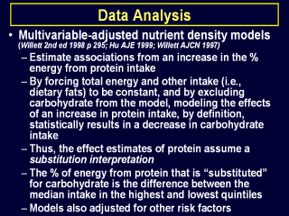 models. These models allow estimation of the effect on each outcome of an increase in the percentage of energy from protein intake. By forcing total energy and other intake (such as, dietary fats) to be constant, and by excluding carbohydrate from the model, modeling the effects of an increase in protein intake, by definition, statistically results in a decrease in carbohydrate intake. Thus, the effect estimates of protein assume a substitution interpretation. This study was not an intervention; we did not ask women to consume higher protein in place of carbohydrate; rather we used a statistical modeling technique with already-collected dietary data to estimate the effect of a protein for carbohydrate substitution. The % of energy from protein that is “substituted” for carbohydrate is the difference between the median intake in the highest and lowest quintiles. The models were also adjusted for other risk factors. (We also evaluated the effect of an isoenergetic substitution of various intakes of high-protein foods in place of carbohydrate-dense foods, and expressed as servings per 1,000 kcalories per day) |