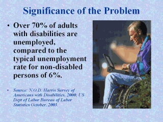 disabilities were unemployed (National Council on Disability, 1996). When race is factored into the equation, the disparity is even greater. In 1992, the full-time employment rate for: Whites with disabilities was 15.9%; Hispanics with disabilities, 8.2%; African Americans with disabilities, only 7.2% (Braddock & Bachelder, 1994). Of those aged 18-64, people with disabilities are much less likely to be employed (either full-time or part-time) than people without disabilities (32% versus 81% respectively). This gap of 49 percentage points is the largest of all the gaps, and may help to explain the persistence of other gaps in income, entertainment, and health care. The presence of a disability seems to be a major factor in determining these gaps in employment. Fully 43% of people with disabilities say they are completely unable to work due to their disability or health problem. Moreover, the more severe the disability, the less likely a person is to be employed. People with slight disabilities are 8 times more likely to be employed than people with very severe disabilities (64% versus 8% respectively), but they are still less likely to be employed than people without disabilities. |