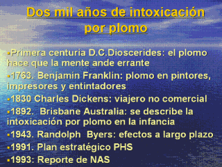 · Dioscerides, médico de Nerón y cirujano en el ejército, escribió que “ el ploma hace que vague la mente”. En el siglo XVIII, Benjamin Franklin, en una carta a su editor, Benjamin Vaughan, gráficamente describió el cólico y muñeca flácida que afectaba a entintadores, pintores e impresores. · En el siglo XIX Charles Dickens describió una visita a una fábrica de plomo fuera de Londres, una mujer gravemente enferma quien había trabajado ahí. · Hasta 1892, cuando J. Lockhart Gibson, en Brisbane Australia, describió intoxicación por plomo en niños, se pensaba que el plomo sólo dañaba a los mineros y a los bebedores de vino. · Después del reporte de Gibson, se creyó que si un niño se intoxicaba con plomo, o moría o se recuperaba sin secuelas. En 1943, Randolph Byers reportó que 20 pacientes niños “recuperados” de intoxicación con plomo, 19 tenían problemas de conducta, fracaso escolar o estaban dañados mentalmente. · Se creyó que las secuelas de la intoxicación por plomo en la infancia se encontró sólo en niños quienes habían sufrido una encefalopatía clínica. · En 1991 el CDC señaló “ Un plan estratégico para la eliminación de la exposición al plomo en la infancia” , un documento histórico de prevención primaria para eliminar el plomo del ambiente antes de entrar a los organismos de los niños. · La evidencia de déficit cognitivo en niños quienes tenías elevaciones asintomáticas de exposición al plomo fue tan fuerte que el reporte NAS concluyó que la toxicidad del plomo se encontró en niños con niveles de plomo de 10µg/dl, o quizá más bajos.” |