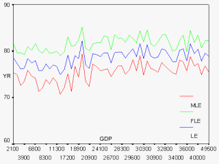 LE is life expectany, MLE male LE and FLE female LE. The order of countries