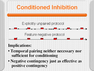| In conditioned inhibition paradigms, the subject learns to avoid a CS that predicts non-reinforcement. In such paradigms, the inhibitory CS is never paired with reinforcement, so there is no temporal pairing, but there is contingency: consideration of whether the CS is or is not present enables subjects to distinguish between periods when the are not likely to get a reinforcement and periods when they are |