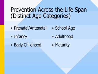 Distinct Age Categories: A. Prenatal/Antenatal (Primary) Good health care and nutrition, and avoidance of toxic substances during the pre-conceptual time prepares a woman for a healthier pregnancy when she is ready to conceive. B. Infancy: Infant Hearing Screening (Secondary): Universal newborn hearing screening is an example of secondary prevention efforts. C. Early Childhood/School-Age: (Secondary): Preschool and kindergarten speech-language and hearing screening programs are examples of secondary prevention. Primary prevention for injuries includes seat belts, helmets, and fire safety. D. School-Age (Tertiary): With school-age children with hearing impairments, an example of tertiary prevention would be provision of habilitative activities (e.g., auditory training, speech reading, speech conservation). E. Adulthood (Secondary, Tertiary): Less common illnesses leading to communication disorders may begin to show signs and symptoms during adulthood (e.g., Parkinson’s, ALS, multiple sclerosis) calling for secondary and tertiary prevention efforts. F. Maturity (Secondary): The ultimate goal of a communication prevention program designed for elderly individuals is to improve or sustain their ability to communicate effectively in as many contexts of choice as possible. This includes early identification of symptoms that might be indicative of a communication problem or of factors that might contribute to deterioration of communication skills Transition Point: Health education prevention models can assist the audiologist and speech-language pathologist in establishing a prevention program... |