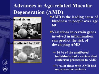 over the next 5 years. Three independent research groups representing NEI intramural scientists and extramural grantees have identified a common variant in complement factor H gene as a risk factor for developing AMD. The CFH gene is responsible for a protein that helps regulate inflammation in part of the immune system that attacks diseased and damaged cells. In certain patients with AMD, inflammation in the eyes may trigger a biological process leading to the disease. People whose genetic make-up includes a variant of the CFH gene are 7.4 times more likely to develop AMD. The study was based on whole genome analysis of participants from the NEI-sponsored Age-Related Eye Diseases Study, a major clinical study that closely followed nearly 5,000 patients with varying stages of AMD. Because these earlier studies have shown that genetic variations in complement pathway genes can cause a dysfunction in the inflammatory response that plays a central role in the pathology of AMD, researchers investigated further. The genes analyzed in this study — Complement Factor B (BF) and Complement Component 2 (C2) — contain the instructions to make proteins that activate the body’s immune defense against microbial infections. These defense responses are part of a system called the complement pathways. One genetic variant conferred an increased risk for AMD, while two genetic variants showed protection against developing this disease. These results, when analyzed in association with results linking AMD and genetic variants of Complement Factor H — a gene than contains the instructions to make a protein that inhibits the complement system — showed that 56 percent of the unaffected individuals had a variant that conferred protection to AMD while 74 percent of those with AMD had no protective variants. |