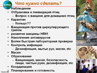 предотвратить? Никто определенно не может ответить на этот вопрос. Один гарантированный способ - это уничтожить вирус у птиц по всему миру, но это невозможно в ближайшем будущем. Лучшая стратегия - активно действовать. Дальнейшие направления: -Полное и исчерпывающее понимание прошлых пандемий -Продуманный план подготовки -Постоянное усилинное наблюдение и тыловое обеспечение Стратегии: -Введение запрета на въезд и выезд из пораженной зоны -Карантин -Истребление -Дезинфекция -Повышать вероятность ранней интервенции по плану ВОЗ (на сегодня существующих в распоряжении ВОЗ антивирусных препаратов хватит на проведение 3 миллионов лечащих курсов) Эти лекарства можно использовать профилактически ближе к началу пандемии для уменьшения риска пробуждения легко передающегося от человека к человеку вируса или, по крайней мере, чтобы задержать межнациональное распространение для выигрыша времени для приращения мощностей по производству вакцины. -Разработка вакцины -Глобальная координация -Массовое образование |