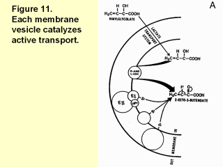 | A. By using an analogue of lactate [2-hydroxy-3-butenoic acid (vinylglycolate; VG)] which is transported by a lactate transport protein and then oxidized inside of the vesicles to a reactive species (2-keto-3-butenoic acid), it is shown that the rate limiting step for covalently labeling vesicles is transport. |