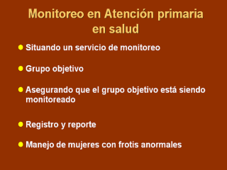 1. Situando un servicio de monitoreo debería incluir un frotis de registro, entrenamiento del personal, una relación de trabajo con un laboratorio, que incluya la aceptación del laboratorio de la responsabilidad de seguimiento de los pacientes con frotis anormales así como relación con la institución que se encargue del manejo. 2. El enfoque del monitoreo en el lugar de PHC debería ser monitorear a cada mujer en el grupo objetivo una vez en su vida hasta los 40 años. 3. Formas de asegurar que el grupo objetivo es monitoreado debería incluir: invitaciones personales, asistentes casuales a la clínica del grupo objetivo o compañeras de las mujeres del grupo objetivo usando los servicios de salud materno infantil/ planificación familiar. Eventos especiales o encuestas podrían organizarse. 4. Manejo de las mujeres con frotis anormales deberían incluir asesoría, citología repetida, manejo/tratamiento así como seguimiento. |