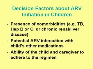 for individuals with significant renal/liver disease); Potential antiretroviral drug interactions with other medications required by the child; and The ability of the caregiver and child to adhere to the regimen. |