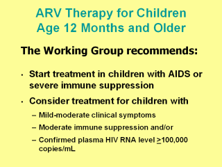 | The Working Group recommends that treatment should be started for all children over age 12 months with AIDS (Clinical Category C) or severe immune suppression (Immune Category 3), and be considered for children who have mild-moderate clinical symptoms (Clinical Categories A or B), moderate immunologic suppression (Immune Category 2), and/or confirmed plasma HIV RNA levels >100,000 copies/mL (Table 8). |