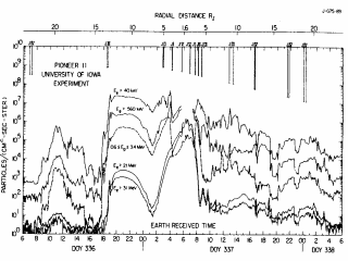 | Figure 7. A graphical assemblage of data on energetic protons and electrons observed by the University of Iowa instrument during the early December 1974 passage of Pioneer 11 through the huge radiation belts of Jupiter. |