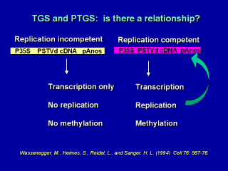 1. The authors found that the viroid cDNA sequence was methylated if the integrated cDNA encoded a replication-competent form of the viroid, but was not methylated if the integrated cDNA encoded a replication-incompetent sequence. That is, if the viroid RNA accumulated to high levels as a result of replication, the gene was methylated. If it was just transcribed, the gene did not get methylated. Moreover, the replication incompetent viroid sequence became methylated if the transgenic line was infected with the viroid. Large amounts of viroid RNA were detected only when the viroid could replicate and the implication of these observations is that there is a feedback loop from the production of large amounts of RNA to methylation of the coding sequence.