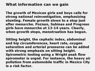 Still, early stunting fits with late obesity. How does the global obesity epidemic fit into this picture? Generally, the appetite of the growth period continues after growth demand stops. Even though this is crystal clear, its recognition warrants special attention. Is malnutritional damage before school age causing shortness, then obesity? An approach to the Progreso boys could assert that they are more damaged by early malnutricion than the girls, but this is by no means known. Is junk food involved ? |