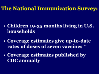 | The National Immunization Survey (NIS), implemented by CDC’s National Immunization Program and National Center for Health Statistics in 1994, has been described as the “backbone of the immunization assessment system”.(13) The target population of the NIS is children 19-35 months living in US households (non-institutionalized). Coverage estimates provide up-to-date coverage rates for seven vaccines and are published annually by CDC. |