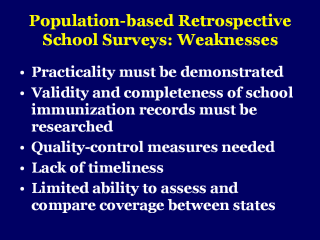 | There are some weaknesses to population-based retrospective school surveys that should be mentioned and some which may be addressable. The practicality of this approach has yet to be identified. The validity of school records must be assessed and quality control measures implemented. Fundamentally, school records suffer in terms of timeliness and there are limitations to comparisons that can be made between states. |
