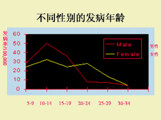 年时,美国男性发病的年龄峰值比女性要大。这可能与女性较低的群体活动有关。然而同其
