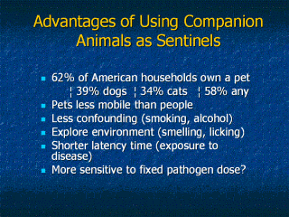 which they live. · Studies have shown that companion animals develop disease as a result of chronic exposure to environmental chemicals such as cancers caused by asbestos (mesothelioma) and herbicides applied to lawns (bladder cancer). · The latency period for these cancers is significantly shorter for animals than it is for humans. For example, the latency period for mesothelioma in humans and dogs is 30-40 years versus 8-10 years, respectively. In contrast the latency period for acute toxicity caused by lead and herbicides is measured in hours or days and is similar in animals and humans. · Dogs and cats may be more sensitive to a fixed pathogen dose due to their higher respiratory and metabolic rate than humans. |