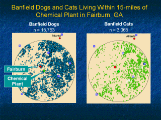 by Banfield veterinary hospitals in the year 2006 · The panel on the right shows the residence of the >3,000 cats seen by Banfield veterinary hospitals in the year 2006 · These dogs and cats served as the denominator to calculate the proportion of pets seen with various clinical syndromes before and after the chemical incident. |