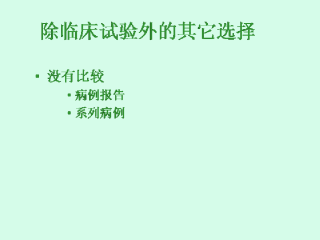 除临床试验外,其它类型的研究也可以用于证明治疗方法的益处。病例报告和系列病例仅提供极弱的证据,除了显示某一结局是可能出现的之外,几乎没有更大的作用。为了宣称一项新的治疗方法是更好的,你必须能够回答这个问题:“比什么更好?”病例报告和系列病例的最大用途在于形成可以在比较性研究中被检测的假设。
