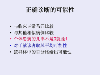 什么是临床医师作出正确诊断的可能性?在诊断过程中,临床医师将本病例和正常马匹或其他病例进行比较。换句话说,对于这匹马的病例作出正确诊断的可能性就是简简单单的0或1。这匹马有或者没有典型的绞痛。然而,临床医师不可以告诉马匹主人说其可能性是1或者0。临床医师要对就诊者作出可能性方面的说明;例如有60%