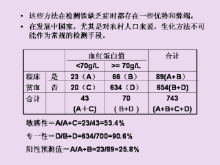 在发展中国家,尤其是对农村人口来说,生化方法不可能作为常规的检测手段,在这种情况下,临床检查可能是唯一用来鉴别贫血的方法。Yip et al 分析了与血红蛋白值比较临床贫血的敏感性、专一性和阳性预测值,见表所示:此时,即便是通过临床检查诊断为贫血的人群中有25.8%的人是真正贫血(阳性预测值),那么在发病率较高的地区治疗假阳性对他们来说也是有益的。这是基于假设贫血人群代表着病情最严重者,但是治疗假阳性者也对哪些认为可能存在铁缺乏的人有益。
