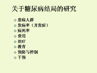 研究,并发症与病死率研究,糖尿病护理、治疗、诊断及预防的经济学研究,患者教育研究以及干预与预防的研究。关于并发症与病死率方面的研究还有待更进一步开展。