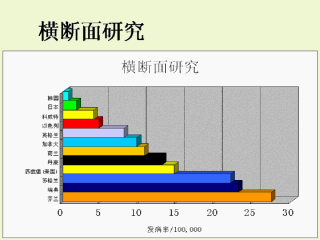 横断面研究用途之一在于其能说明发病率。如图所示,不同国家胰岛素依赖型糖尿病的发病率相差很大。有报道的发病率最低在韩国,而最高则在芬兰,二者之间差距竟高达40倍。基于横断面研究我们很快可以注意到遗传与环境条件都应被视为胰岛素依赖型糖尿病的危险因素。在此研究中,我们还能发现不同地区胰岛素依赖型糖尿病的发病率由低到高依次为亚洲、北美、北欧。