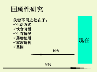 第二类研究方法是回顾性研究。这是一种以过去的资料为研究基础的方法。在研究开始之初我们已清楚研究对象的发病情况。我们通常选取一组患病的人群与一组正常的健康人群,通过比较试着从中找出潜在的致病原因。研究者通常都会从种种的可能危险因素入手调查。尽管回顾性研究的结果往往会受回忆偏倚的影响,但这种研究更为经济,并能在较短时间内完成,因此最适用于罕见疾病的研究。