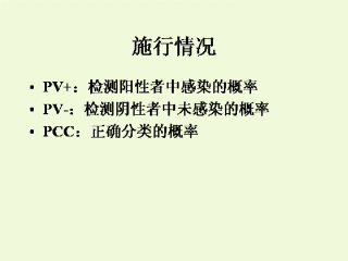 筛检试验的实施用它的预测值来衡量。阳性预测值(PV+)或者筛检项目的效率,是检测为阳性而真正感染的概率。阴性预测值(PV-)是筛检试验为阴性的个体真正未感染的概率。与敏感性和特异性相反,预测值是由患病率决定的,患病率越高PV+越高,PV-越低。正确分类的百分比是筛检项目将个体正确分为感染或未感染的能力。计算这些测量指标的方法会在后面的幻灯片中给出。