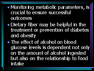 Daily consumption of a diet containing 20-35 g dietary fiber from both soluble and insoluble fibers. The percent of calories from carbohydrate will also vary and is individualized based on the individual's eating habits and glucose and lipid goals. Alcohol is not metabolized to glucose and inhibits gluconeogenesis; therefore, if alcohol is consumed without food by people treated with insulin or oral glucose-lowering agents, hypoglycemia can result. Hypocaloric diets and weight loss usually improve short-term glycemic levels and have the potential to improve long-term metabolic control. |