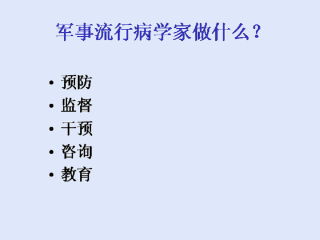 方面。以下幻灯片描述军事流行病学家日常从事的一些活动。