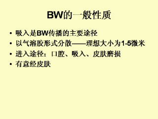 尽管不同类型的生物战剂有差异,这些细菌、病毒和毒素等战剂有一些共同特征。BW传染或“经口入”的主要途径是吸入(肺)。由于BW为不挥发的,必须以气溶胶形式分散,气溶胶为直径1-5微米大小(毛囊直径的1/30000)的颗粒,可以在空气中悬浮数小时(具体时间视不同天气情况而定)。颗粒被吸入后会沉积在肺泡终囊,从而引起疾病。