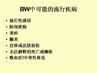 气溶胶散布后经过一段典型的潜伏期,大多数的BW制剂都会导致发热、发冷、不适、头痛、肌痛等流感初期症状。一些BW制剂则会导致症状迅速发展为呼吸困难、发绀、胸痛、X射线显影异常等肺部疾病。肝脏酶的增加表明肝脏病变,可并发或不并发黄疸。一些病毒制剂可导致脑炎,以畏光、精神错乱、颈亢为典型症状。以小泡、脓疱或溃疡性皮肤损伤,有时有出血变态为症状的斑丘疹可在一些制剂使用后出现。一些制剂使用后可出现无法解释的死亡或软瘫,表明可能使用的是生物毒素。