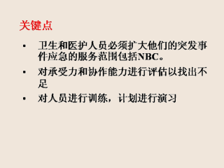 -为了应对处理那些NBC袭击的受害者,医院必须准备好扩大他们的服务范围。这将要求医院储备一定的解毒剂,提供不同标准的PPE,并且对人员进行培训。也许还需要成立对特别小组,进行专门学习和训练,以掌握NBC武器知识、消毒和解毒剂治疗等。在一些情况下,这些人员可能会和其它反应小组(如HMRT,MMST)等在袭击现场进行工作。所有这些紧急情况处理小组的职责都被归到地方事故指挥系统统一领导。