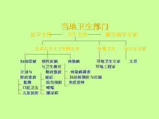 这张幻灯片显示了一个公共卫生部门怎样组织起来提供公共卫生服务的例子。公共卫生部门会提供一些传统的服务,像环境卫生服务、妇幼卫生、传染病服务。同时现在慢性疾病也是主要的死因之一,现在的地方公共卫生部门也会有一个部门负责慢性疾病及损伤的。另外,地方公共卫生部门也应该提供急救医疗服务。