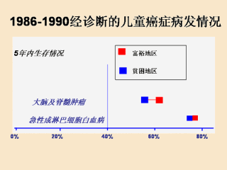 这张统计图表明了在儿童中最普遍发生的癌症的生存情况在最富裕地区与最贫困地区的差异。