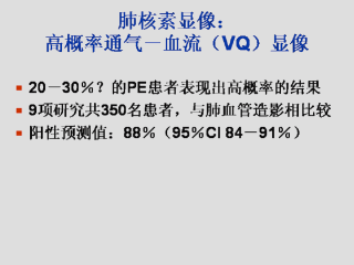 在大多数患者中,高概率的肺显像结果是与PE相对应。高概率的定义为:一个或多个肺段或更大面积的灌注缺损,但局部的通气正常。因此,有理由对这些患者进行抗凝治疗。有一种例外的情况,那就是,患者可能患有其它疾病,例如肺占位,就能够造成灌注-通气的不匹配。