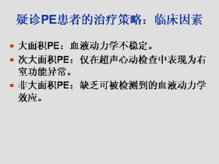 临床上的发现很大程度上决定了采用何种策略。在大面积PE时,超声心动图有着重要的作用。在次大面积PE时,超声心动图可能会有意义,但仍然需要等待其它进一步的检测的结果。在非大面积PE时,可以采用多种策略,使用多种(甚或全部!)诊断检测手段。