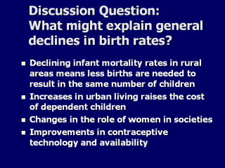 care for them in old age. Increasing urbanization changes the traditional values placed upon fertility and the value of children in rural society. Urban living also raises the cost of dependent children to a nuclear family (education and clothing costs increase). Increasing female literacy, employment of women, and valuation of women beyond childbearing and motherhood may all affect the number of children a woman chooses to have. Improvements in contraceptive technology, availability, and education also all impact birth rates. |
