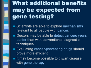 explore mechanisms relevant to all people with cancer. Genes and gene markers may also provide tools for improving cancer diagnosis and treatment. By spotting a mutated gene (or its protein product) in cells shed into stool, urine, or saliva, or in tissue biopsies, doctors may be able to detect cancers years earlier than with conventional diagnostic techniques. (It has even been suggested that some day probes for a mutated gene could be injected, then traced on an x-ray.) Evaluating cancer-preventing drugs, too, should prove more efficient once the drugs can be tested in populations that are highly likely to develop the cancer. Or, if a gene is found to produce some antitumor protein, it might be possible to synthesize that protein and use it as a drug. Ultimately, it may become possible to thwart disease with gene therapy - inactivating the flawed gene or replacing it. |