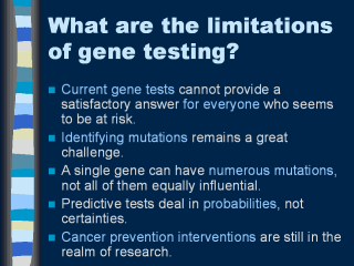 of the families with hereditary breast cancer. Second, despite major advances in DNA technology, identifying mutations remains a great challenge. Many of the genes of greatest interest to researchers are enormous, containing many thousands of bases. Mutations can occur anywhere, and searching through long stretches of DNA is difficult. In addition, a single gene can have numerous mutations, not all of them equally influential. The cystic fibrosis gene, for instance, can display any one of more than 300 different mutations, which cause varying degrees of disease; some seem to cause no symptoms at all. Thus, a positive test does not guarantee that disease is imminent, while a negative test - since it evaluates only the more common mutations - cannot completely rule it out. Furthermore, predictive tests deal in probabilities, not certainties. One person with a given gene, even one that is dominant like the hereditary breast cancer gene, may develop disease, while another person remains healthy, and no one yet knows why. A gene may respond to the commands of other genes or be switched on by an environmental factor such as sunlight. Perhaps the most important limitation of gene testing is that test information often is not matched by state-of-the-art diagnostics and therapies. Many diseases and many types of cancer still lack optimal screening procedures; it is often not possible to detect an early cancer even in an individual with a known predisposition. In inherited breast cancer, frequent screening with mammography offers the best chance of early detection, but falls short of prevention. Moreover, mammography is least effective in the glandular breasts of young women, the very ones at greatest risk from an inherited susceptibility. For the moment, the best assurance of prevention may lie in drastic and costly surgery to remove the breasts - but even a total mastectomy can leave some breast cells behind. As for the ovarian cancer that threatens high-risk families, available screening measures often cannot discover disease in time. Here, too, women in high-risk families often opt for prophylactic surgery to remove the ovaries. To date, however, neither type of prophylactic surgery has been proven to prevent completely the occurrence of cancer. Scientists are actively studying interventions aimed at the prevention of cancer. For example, ongoing clinical trials are evaluating the use of tamoxifen, an anticancer drug, as a breast cancer preventive. However, such approaches are still in the realm of research. |