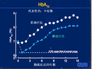 接下来我们来考虑对危险因子的干涉能否降低糖尿病患者得心血管疾病的死亡率。UKPDS试图回答对高血糖的控制能否改善心血管疾病的风险。病人被随机分组后经过3个月单纯的饮食控制,有的采取使用胰岛素或sulfhonylureas的激进疗法,有的采用常规疗法。在整个过程中,激进疗法可以使HbA1c的水平比常规疗法的效果降低1%。