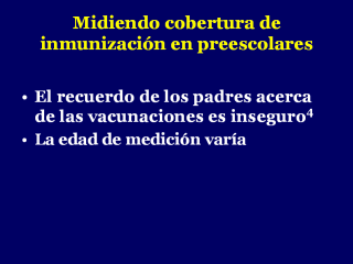 mida la cobertura de inmunización. La edad en la cual se mide la cobertura varía, típicamente 12, 24 o 36 meses o rangos de edad tales como niños de 19-35 meses. |