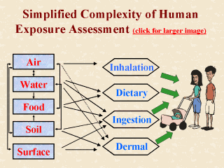quantifying internal aggregate dose. This lecture continues to discuss the dynamic and complex components and methodologies of HEA, but with a focus on the use of various indirect measurement methods (IMM) as tools to estimate the doses from separate routes of entry and from separate exposure media. Depending on the share they each have of the aggregate dose, not all of these separate doses need to be determined or summed. In health risk assessment, of which HEA is a key component, the IMM approach is by far more popular than the use of HBM in assessing human exposure to environmental contaminants, primarily because the former is more practical and economical. As mentioned in Lecture 7, a knowledge of the chemical's pharmacokinetics is a prerequisite for conducting HBM. Yet such a knowledge is not always available or easily attainable. Also, collection of body fluids from humans, including urine, is considered to be quite an invasive ordeal to many people. |