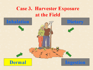 duration]. The term dislodgeable foliar residues (DFR) is defined as the amount of (pesticide) residues that can be removed from (both sides of) treated foliage surfaces using aqueous surfactant. The residues on the leaf discs punched in the field are to be dislodged in the lab through some standardized agitation force exerting on the solution for a fixed time period before extraction. Here dermal transfer rate (TR) is referred to simply as the ratio (or sometimes some other relation, such as linear regression) of hourly dermal exposure (i.e., residues on the skin or clothing) typically in m g/hr to DFR in m g/cm2. Both of these variables should be measured more or less concurrently but separately. When multiplied with a proper dermal TR, whose value is either learned through other studies or based on some professional judgement, the DFR under study may be readily converted to hourly dermal exposure of workers reentering treated areas. U.S. EPA (2000a) has published a list of the dermal coefficients (TR) for a great variety of reentry activities.The calculations of the doses, if any significant, from drinking water, ambient air, dietary intake, and hand-to-mouth from eating fruits (e.g., strawberries) at the field, are essentially the same as those discussed in the first case. |