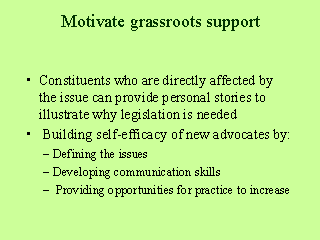 All too often, legislation is enacted, changed, or dissolved without the public’s knowledge. Legislative initiatives will always be enhanced through personal involvement. Providing useful ways for the public to get involved will increase the likelihood of success. |