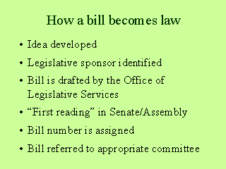 You may be successful in educating legislators about your issue; they may agree to sponsor a bill to help address the problem. However, there are many steps needed before a bill actually becomes law at the local, state and federal level. In fact, in most states, only about 10% of the bills introduced each year actually make it through the process and become laws. You will need to take action at each step along the way to ensure success. |
